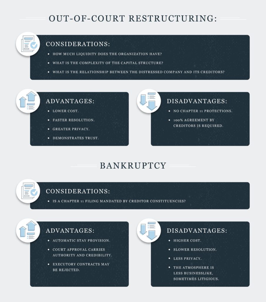 Should the company proceed informally with an out-of-court restructuring or through an in-court restructuring under Chapter 11 of the Bankruptcy Code? For each distressed company, there are unique legal and business circumstances that will help determine which option is best.