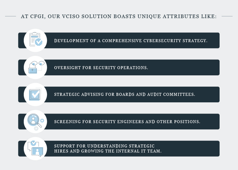 CFGI’s vCISO offering provides you with independent, scalable, as-needed strategic cybersecurity support. Our experts are capable of assisting organizations of all sizes and across industries, as they seek to address a wide variety of cybersecurity concerns.