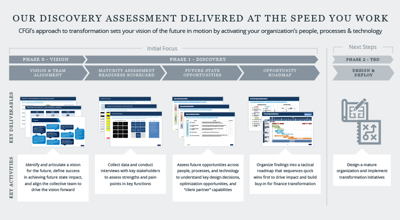 Having a transformation roadmap builds confidence that your objectives are thoughtful, validated and achievable. Our rapid discovery assessment, which focuses on people, processes and technology, can help you identify where your FP&A organization can benefit from transformation.